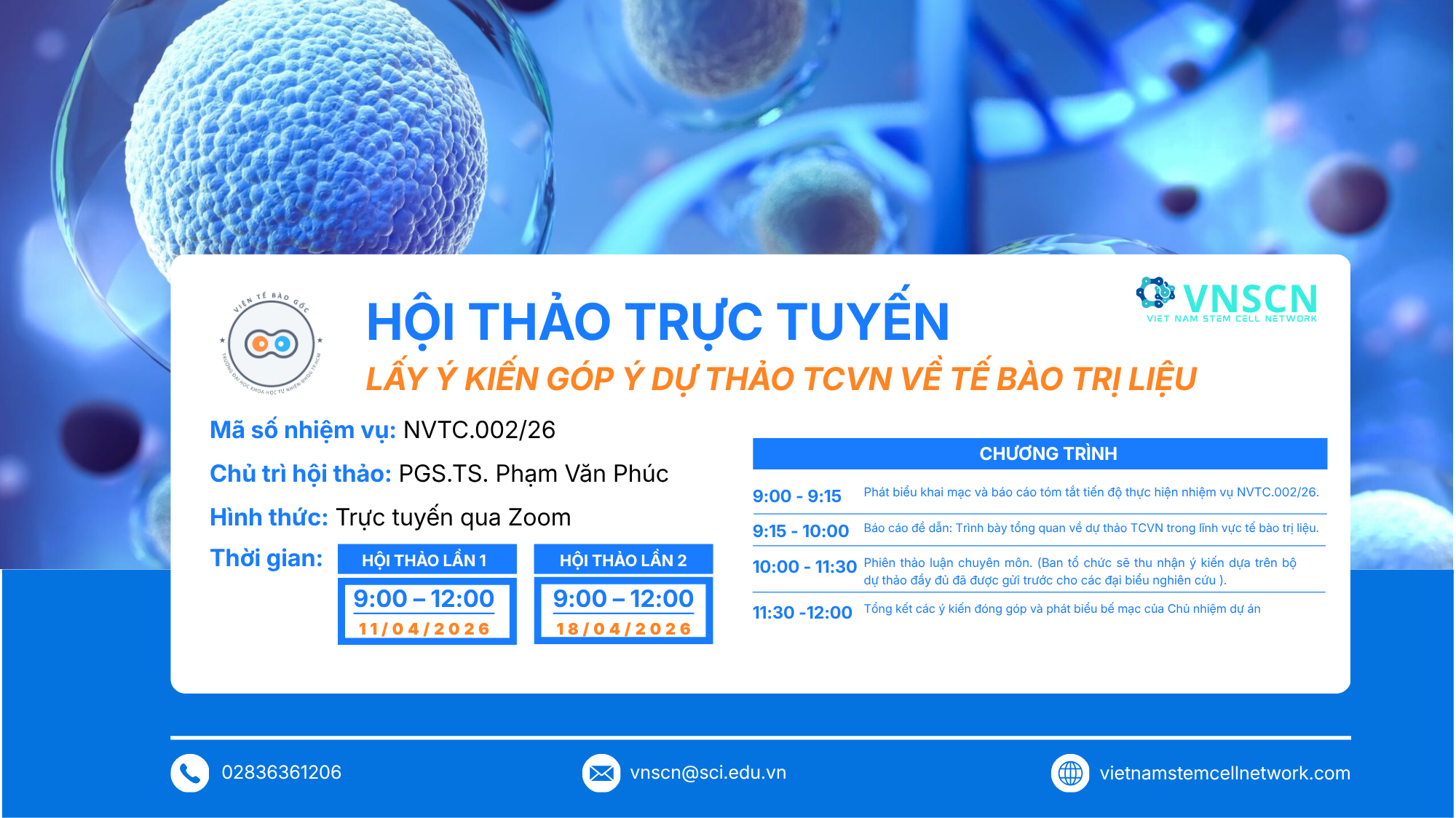 THƯ MỜI: Về việc tham dự Hội thảo trực tuyến Góp ý dự thảo Tiêu chuẩn Quốc gia (TCVN) về tế bào trị liệu